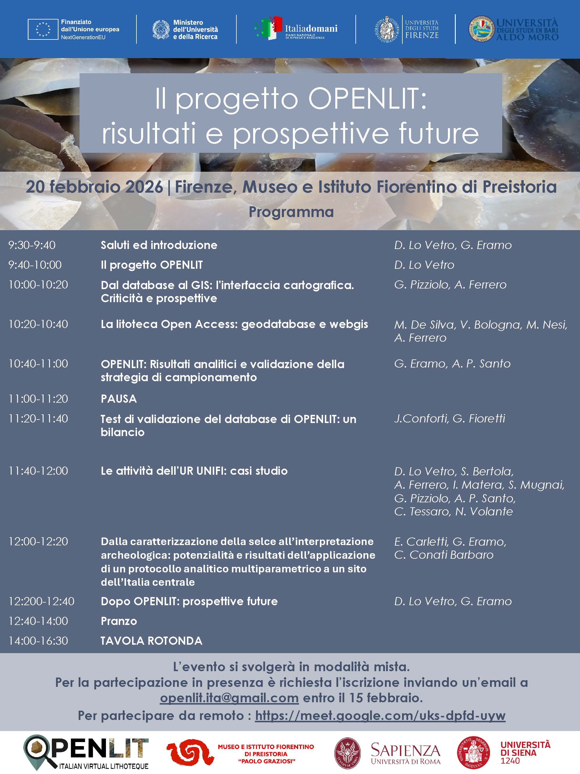 OPENLIT project held the final event "OPENLIT project: results and prospects for the future" on February 20th. The event took place in Florence at the Museo e Istituto Fiorentino di Preistoria “Paolo Graziosi". The activities were organized by the University of Florence and the University of Bari - Aldo Moro, in collaboration with the University of Rome "La Sapienza", the University of Siena and the Museo e Istituto Fiorentino di Preistoria “Paolo Graziosi”.